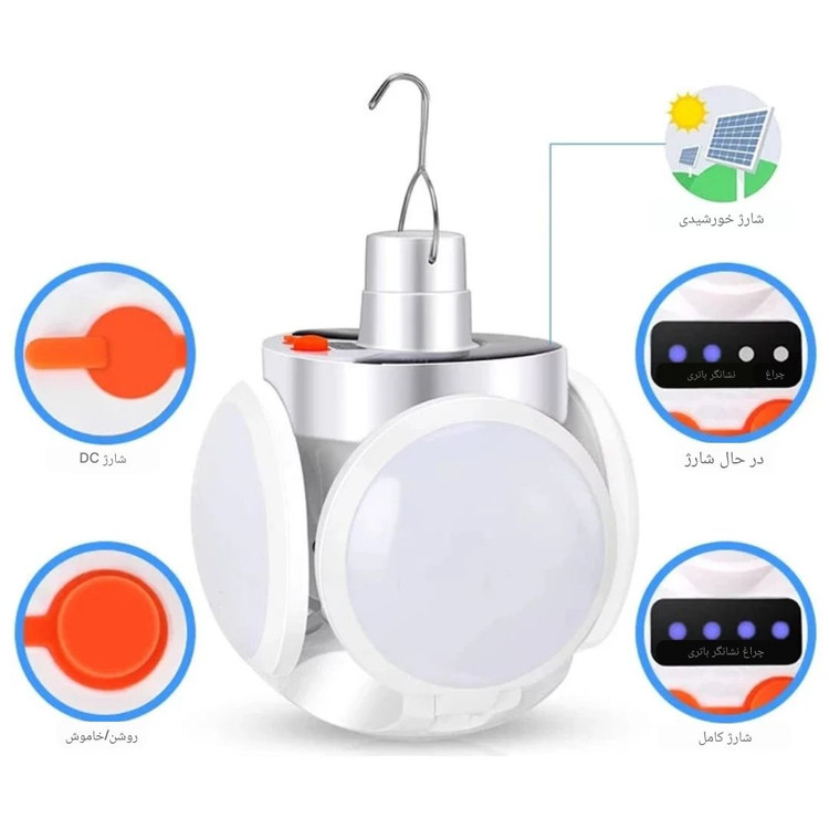 - چراغ اضطراری و لامپ خورشیدی شارژی دارای 5 لامپ LED با نور 360 درجه